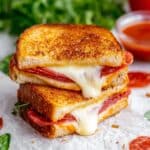 Keywords: Pizza Grilled Cheese, Pepperoni Grilled Cheese, Easy Sandwich, Skillet Grilled Cheese, Cheesy Pizza Sandwich
