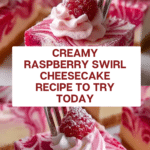 This luscious Raspberry Swirl Cheesecake combines a buttery graham cracker crust with a creamy, smooth vanilla cheesecake infused with fresh raspberry puree and beautifully swirled for a stunning presentation. Topped with whipped cream, fresh raspberries, and a dusting of powdered sugar, it’s a perfect dessert for any occasion.
