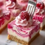 This luscious Raspberry Swirl Cheesecake combines a buttery graham cracker crust with a creamy, smooth vanilla cheesecake infused with fresh raspberry puree and beautifully swirled for a stunning presentation. Topped with whipped cream, fresh raspberries, and a dusting of powdered sugar, it’s a perfect dessert for any occasion.