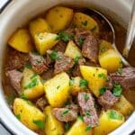 This Slow Cooker Steak and Cheddar Potato Casserole is a hearty and comforting dish perfect for cozy family dinners. Tender cubes of seared sirloin or ribeye steak layered with thinly sliced potatoes, onions, garlic, and sharp cheddar cheese all slow-cooked to perfection in a rich blend of beef broth and heavy cream.
