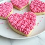A close-up of heart-shaped sugar cookies on a white plate resting on a white marbled surface, each cookie topped with thick, bright pink frosting shaped in multiple rows of smooth, rounded petal-like dollops covering the whole cookie surface, creating a textured, layered look, with small pink round sprinkles scattered lightly around the plate edges photo taken with an iphone --ar 4:5 --v 7