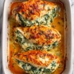 Delicious and creamy Spinach Stuffed Chicken Breasts baked to perfection. This recipe features tender chicken breasts filled with a savory mixture of cream cheese, Parmesan, mayonnaise, fresh spinach, and spices, resulting in a flavorful and comforting meal that’s easy to prepare and perfect for any weeknight dinner.