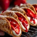 These Strawberry Cheesecake Dessert Tacos combine crispy cinnamon sugar-coated tortilla shells with a smooth, creamy cheesecake filling and a fresh, homemade strawberry sauce. A delightful treat that offers the texture of tacos with the flavors of a classic strawberry cheesecake dessert, perfect for a fun and elegant dessert option.