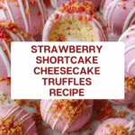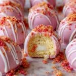 These Strawberry Shortcake Cheesecake Truffles combine creamy cheesecake filling with a crunchy Golden Oreo crust, all coated in vibrant pink chocolate. Topped with a delightful strawberry shortcake crumble, these no-bake truffles are perfect bite-sized treats bursting with strawberry flavor and creamy sweetness.