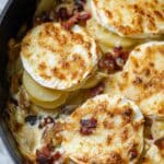 Tartiflette is a classic French potato gratin dish featuring waxy potatoes, crispy bacon lardons, caramelized onions, garlic, and oozy melted Reblochon cheese baked to perfection. This rich and comforting casserole is finished with a drizzle of cream and white wine for a deliciously creamy texture and savory flavor that embodies the warmth of Alpine cooking.