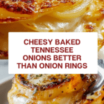 Tennessee Onions are a cheesy baked side dish featuring thickly sliced sweet onions layered with butter, Italian seasoning, and a trio of cheeses—mozzarella, provolone, and Parmesan. Baked until golden and bubbly, this rich and flavorful dish offers a delightful alternative to traditional onion rings.