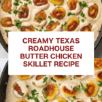 Texas Roadhouse Butter Chicken Skillet is a creamy, flavorful dish featuring tender chicken breasts or thighs seared in butter and simmered in a rich sauce with garlic, honey, and spices. Enhanced with optional cheese, caramelized onions, and a Mediterranean touch from cherry tomatoes and kalamata olives, this skillet meal is easy to prepare and perfect served with garlic mashed potatoes or roasted vegetables.