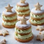 - Assemble the Christmas Tree Cream Puffs: Slice each cooled puff horizontally in half. Fit a piping bag with a star tip and fill with pistachio whipped cream. Pipe a generous layer of cream onto the bottom halves of each puff size. Build each tree by stacking the largest puff on the bottom, then the medium, and finally the smallest on top, piping cream between layers to hold them together. Top with a shortbread star cookie. Dust lightly with powdered sugar to create a snowy effect. Serve immediately or refrigerate until ready to serve.