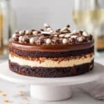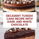 This Tuxedo Cake is a stunning and rich layered dessert featuring moist chocolate cake layers filled with smooth dark and white chocolate mousses, topped with a glossy chocolate ganache. Perfect for special occasions, this elegant cake combines the deep flavors of dark, milk, and white chocolate with a delicate espresso hint in the cake, creating a truly decadent treat.