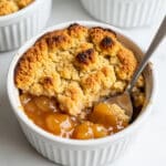 This image shows a white ramekin filled with a warm dessert that has two main layers. The bottom layer is a glossy, golden-brown cooked fruit filling, likely apple, with a smooth sauce that looks juicy and sticky. The top layer is a thick, crumbly, and golden crust with a rough texture that looks like baked dough or crumble topping. The crust has some darker spots where it has browned in the oven. A silver spoon is placed inside the ramekin on the right side, slightly digging into the dessert. The ramekin sits on a white marbled surface, and there is another similar ramekin blurred in the background. The colors are warm and inviting, showing a fresh baked comfort food. Photo taken with an iphone --ar 4:5 --v 7