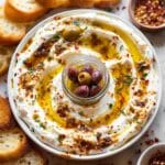 8. Transfer and drizzle: Spoon the whipped feta into a serving dish and drizzle extra virgin olive oil on top for added richness.